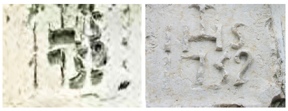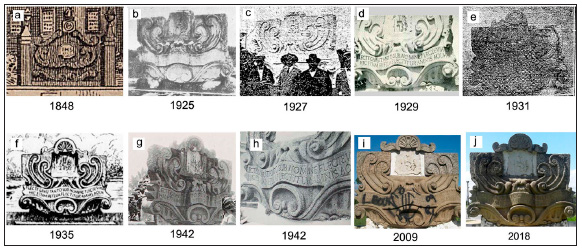 No conjunto de representações do dístico, apenas o brasão jesuítico manteve suas caraterísticas desde o século XIX. Apesar da corrosão da borda hexagonal e das gravações em alto-relevo, o brasão atual pode ser identificado como o retratado por Niemeyer em 1848. O efeito da erosão sobre a rocha em período mais recente pode ser avaliado ao comparar-se a imagem de 1929 com uma imagem atual (Figura 16).