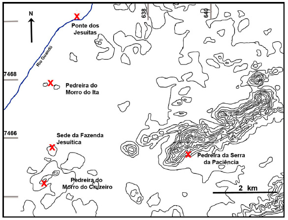 Três grandes pedreiras funcionaram no entorno da sede da Fazenda Santa Cruz (Figura 17), todas situadas às margens da estrada que fazia a ligação entre a casa central e a Ponte dos Jesuítas. A pedreira mais próxima, situada um quilômetro ao sul da sede, no hoje conhecido Morro do Cruzeiro, manteve-se ativa por quase duzentos anos.68 Suas rochas foram utilizadas na construção do monastério no início do século XVIII e do Matadouro Imperial de Santa Cruz ao final do século XIX.69 A segunda pedreira situava-se na Serra da Paciência, quatro quilômetros a leste do monastério. Ambas estavam a uma distância de aproximadamente cinco quilômetros do local onde foi erguida a Ponte dos Jesuítas. A terceira pedreira, do Morro do Itá (itá = pedra), se encontrava a dois quilômetros do local de construção da ponte, onde hoje está o Parque Municipal Cidade da Criança, no entroncamento da estrada Rio-Santos com a avenida Brasil. Essa antiga pedreira, hoje desativada, apresenta várias feições que evidenciam processos de extração a frio.