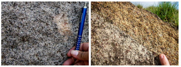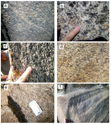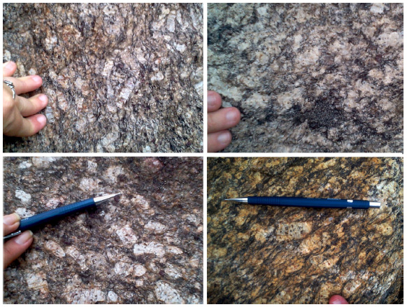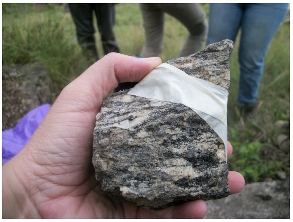 A Serra da Paciência e o Morro do Cruzeiro são formados por ortognaisses com diferentes graus de deformação, variando de litotipos com texturas ígneas preservadas a gnaisses miloníticos. A variação do grau de deformação resulta em tipos texturalmente distintos (Figura 18). A rocha predominante é um granada-biotita gnaisse com porfiroclastos centimétricos de microclina. Megacristais de feldspato chegam a ultrapassar quatro centímetros, e a granada se destaca como grão arredondado, vermelho escuro, de poucos milímetros a dois centímetros. Os tipos com textura ígnea preservada possuem feldspatos tabulares. O Morro do Itá, por sua vez, é formado por allanita granito equigranular de grão fino, estruturalmente isotrópico, de coloração cinza-clara passando a rosa - um rosa-amarelado, em razão do aumento do grau intempérico (Figura 19). Allanita prismática, de cor negra, exibe halos avermelhados, resultantes da emissão de partículas radioativas sobre feldspatos adjacentes. Tal rocha tem sua origem como diques tabulares com poucos metros de largura, sendo conhecida, no Rio de Janeiro, como “Granito Favela”, em razão da frequência com que ocorre no topo dos morros cariocas.70 Nas pesquisas de campo realizadas nesse trabalho, allanita granito foi a única rocha encontrada aflorando na antiga pedreira do Morro do Itá, onde gnaisses ocorrem apenas como enclaves de poucos centímetros, tendo também sido encontrado junto à pedreira um bloco isolado de granada-biotita gnaisse porfiroclástico com granada (Figura 20).