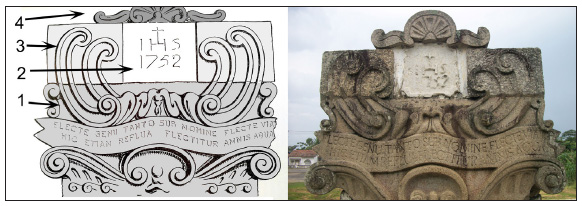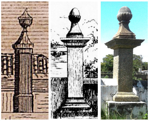 Assim como Netto, Silva relata em 1934 que, quando visitou a ponte em 1927, existiam poucas colunas, e as restantes estavam completamente caiadas, com aparência de recém-reconstituídas.20 O autor atenta para o equívoco de Américo Netto na disposição das palavras e na grafia de genua acqua, observando que a data e as iniciais IHS estariam sob uma cruz, associadas em um escudo, enquanto a legenda estaria “embaixo do escudo em uma espécie de faixa” com as palavras dispostas em apenas duas linhas. Tal descrição de Silva está de acordo com a configuração atual do dístico. Mas, assim como Américo Netto, Silva reconhece o ano de 1732 na inscrição em alto-relevo, e não 1752, como correntemente aceito.