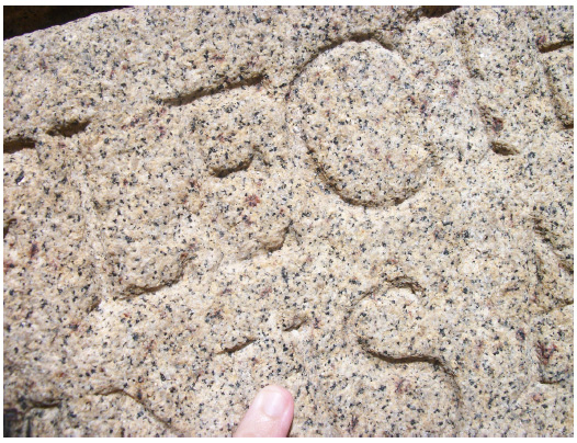 A base é esculpida em monobloco maciço de allanita granito, de cor rósea, com composição e textura compatível com as rochas do Morro do Ita (Figura 23). Observações na pedreira e análise de seções delgadas de suas rochas revelam que a passagem da cor cinza para rósea resulta do maior grau de alteração dos minerais ricos em ferro e dos feldspatos (Figuras 19 e 24).