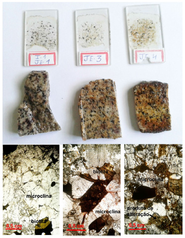 As dificuldades que envolvem o transporte de rochas fazem da pedreira do Morro do Itá a mais provável fonte de matéria-prima para a construção da Ponte dos Jesuítas. Contudo, o estudo petrográfico revelou o uso não apenas de granito, mas também de gnaisses equivalentes aos aflorantes no Morro do Cruzeiro e na Serra da Paciência, na composição de cantarias que revestem paredes laterais e arcos (Figura 21 a, b, c, d), enquanto blocos da mesoestrutura são, predominantemente, de allanita granito (Figura 21 e, f). O gnaisse predominante nas cantarias exibe foliação anastomosada ao redor de porfiroclastos de microclina e de granada, mas, assim como no Morro do Cruzeiro e nas paredes do Matadouro Imperial, há tipos com feldspatos centimétricos com hábito tabular, representativos de porções menos deformadas do protólito ígneo.