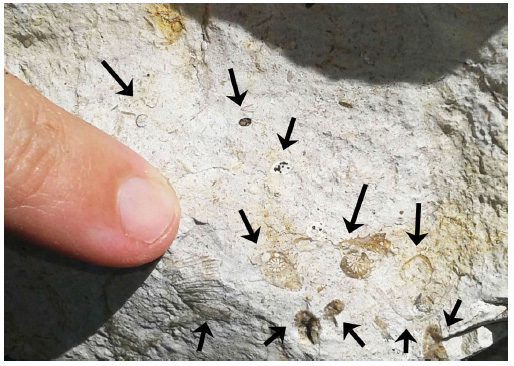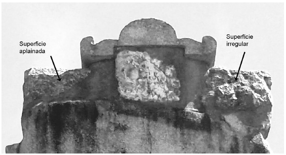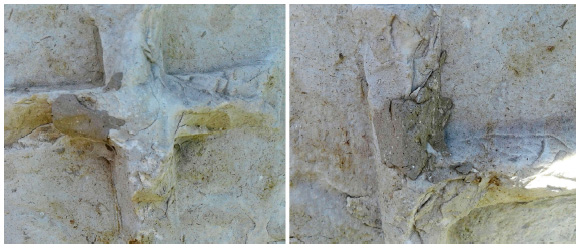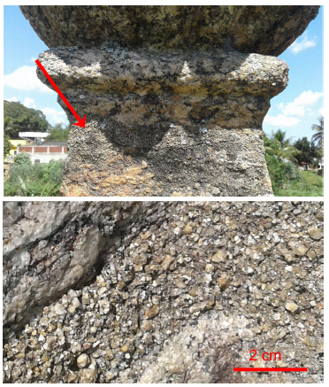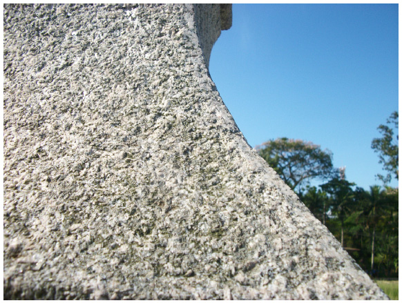Freitas72 presume, equivocadamente, que a extremidade da fita não teria sido rompida, mas erodida, por ser o bloco composto em “pedra de Lioz”. O termo “lioz” é aplicado a um tipo de calcário que ocorre nos arredores de Lisboa e do qual foram trazidos vários exemplares no período colonial. Contudo, muitos monumentos no Brasil tidos como de pedra lioz são compostos na realidade por rochas nacionais, como é o caso da base granítica do dístico. A única rocha com composição equivalente à da pedra lioz na Ponte dos Jesuítas é o bloco que contém o símbolo da Companhia de Jesus. Trata-se de uma rocha carbonática branca com manchas amareladas e superfície fosca, em que é possível reconhecer somatofósseis (Figura 26).
