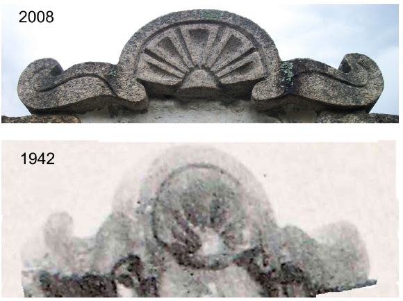 A rocha utilizada na escultura solar que arremata o brasão jesuítico é um granito cinza-rosado, equigranular, de granulação grossa, com feldspatos idiomórficos tabulares, sem correspondentes nas pedreiras de Santa Cruz. O grau de planificação de sua superfície é distinto do de superfícies rústicas, irregulares, vistas nas demais cantarias do dístico. Trata-se, portanto, de uma peça moderna, moldada em uma rocha sem conexão com a geologia local. O fato de a escultura atual ser composta em monobloco, sem emendas, permite concluir que essa não corresponde à escultura fotografada em 1931, sem a espiral direita, pelo O Globo76. Na Figura 29 é possível comparar a peça como se apresenta hoje e na imagem publicada em 1942.77