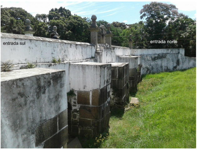Em sua configuração atual, a Ponte dos Jesuítas tem 25 metros de comprimento e 5 metros de largura (Figura 1). Seu tabuleiro é pavimentado com blocos irregulares de pedras e apoiado sobre quatro arcos, sendo o arco sul o de maior dimensão. Os parapeitos possuem oito colunas ornamentais, dotadas de capitéis e pinhas. O dístico com a frase latina e o brasão jesuítico se encontram no centro do parapeito oeste (Figura 2), ladeados por duas colunas que se confrontam com outro par no parapeito oposto. As demais colunas ornam as entradas sul e norte, cada qual exibindo distância distinta em relação ao centro da ponte (em torno de 12,7 m para as colunas ao norte e 11 m para as colunas ao sul). A estrutura interna das paredes dos parapeitos e dos muros de tímpano, parcialmente exposta durante as obras de restauração em 2009, é formada por blocos de rochas com intervalos de entre 15 cm e 25 cm. A face leste da ponte (Figura 3) apresenta cinco talhantes trapezoidais. Em pontes de pedra, a forma dos talhantes a montante era tipicamente triangular, a fim de atenuar a força da corrente de água, diminuindo o impacto sobre os pilares.44 A forma trapezoidal observada nos talhantes a montante na Ponte dos Jesuítas teria a mesma função.