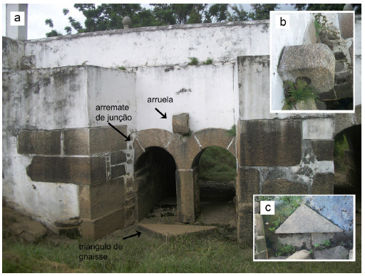 Duas cantarias de granada-biotita gnaisse porfiroclástico ladeiam o bloco de calcário (Figura 24). Contudo, apesar de serem formadas pela mesma rocha, as cantarias gnáissicas exibem cores diferentes entre si. A situada à direita possui cor acinzentada, e a situada à esquerda, amarelo-avermelhada, o que indica maior tempo de exposição do bloco esquerdo, sugerindo períodos distintos de instalação das cantarias. Nota-se também, na peça avermelhada, um grau maior de erosão da matriz ao redor dos porfiroclastos, o que dá à superfície um aspecto mais rugoso, favorecendo a hipótese de maior tempo de exposição. Os blocos de gnaisse também apresentam acabamentos distintos em suas faces posteriores. O da esquerda, tido como o mais antigo em função de sua coloração e grau de erosão, exibe superfície mais rústica, menos aplainada que o direito (Figura 28).
