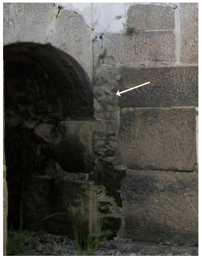 Na restauração da extremidade direita da fita não foi utilizado granito correlato, como seria apropriado, mas sim granada-biotita gnaisse porfiroclástico, fixado com uma camada de cimento cujo agregado, de granulação grossa, contém grãos de quartzo, feldspato e biotita (Figura 25).