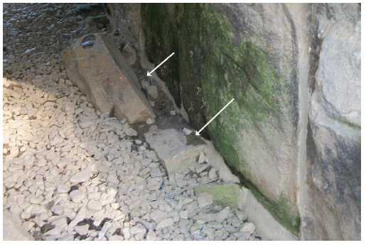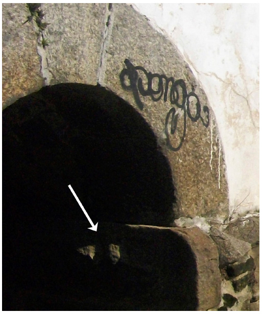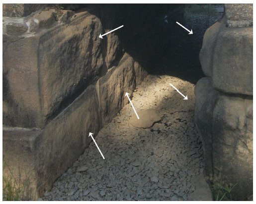 Há, no encontro dos talhantes com a ponte, faixas estreitas revestidas por blocos irregulares de rochas unidos por cimento e que podem representar cicatrizes de antigos encaixes das comportas (Figura 33). Em um dos arcos medianos foi observada uma cantaria de arremate na junção do talhante com a pilastra (Figura 34). Peças semelhantes, de formato prismático e base triangular, foram encontradas no interior de um dos túneis, sugerindo que, no passado, as junções teriam sido protegidas por tal material (Figura 35).