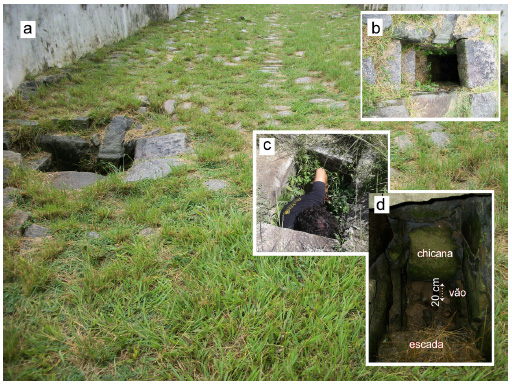 À esquerda da entrada sul da ponte, uma abertura no piso do tabuleiro dá acesso a uma escadaria de cinco degraus que se projeta na direção de um dos talhantes, conduzindo a um vão com aproximadamente dois metros de altura, no qual um homem, de braços fechados, pode permanecer em pé. O espaço estreito é totalmente bloqueado por cantarias, à exceção de uma abertura retangular junto ao solo, com menos de 20 cm de altura, semelhante a uma chicana, e que permite o escoamento da água pluvial (Figura 36). Entre a população há a crença, fortalecida pela mídia, de que tal abertura seria a entrada de um túnel que liga o antigo mosteiro à ponte.81 Em edição de O Globo de 1929, a Diretoria do Patrimônio esclarece que a abertura era uma “passagem para os padres tomarem banho”, então bloqueada pela queda de um bloco.82 Freitas também afirma que a ponte era dotada de uma escada de pedra pela qual se tinha acesso a uma área de banho, utilizada quando as comportas estavam fechadas.83 Por fim, a empresa responsável pelo restauro da ponte em 2005 registra em sua relação de obras “a limpeza da escada de acesso a uma das galerias”.84
