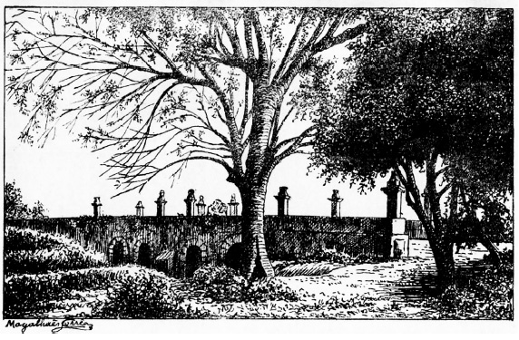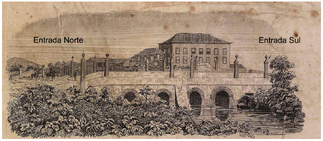 Construíram uma ponte sobre o rio Guandu, perto da olaria, toda de cantaria, apoiada em arcos desiguais. Com um adequado sistema de comportas conseguiam eles fechar o leito do rio ao curso das águas, ora totalmente, ora em parte; ou diminuíam a vontade o volume de água que descia, ou aumentavam, ou interrompiam, completamente a comunicação entre as partes superior e inferior do rio, situadas dos dois lados da ponte. Se nas épocas das enchentes as águas assoberbavam-se, ameaçando de inundação dos terrenos de uma e outra margem, os jesuítas fechavam as comportas, e as águas diante deste obstáculo voltavam sobre si, e escoavam pela saída fácil do canal até o Rio Grande e deste até o mar. […] A porção superior, toda de pedra, é algum capricho na construção: colunas, relevos, partes esculpidas, pavimento calçado e abaulado; e mais se realça pelo pensamento, em língua latina, que os jesuítas fizeram gravar na principal pedra da parede da direita.16