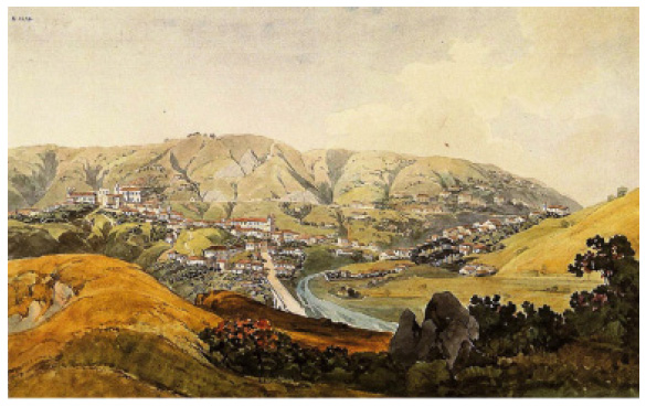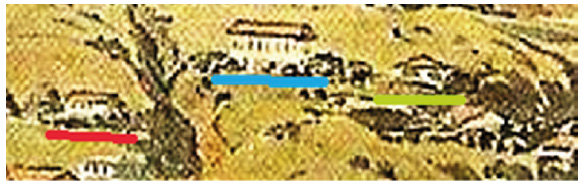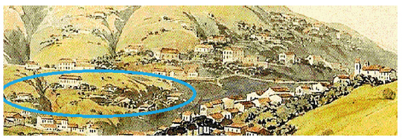 Dispomos de algumas representações iconográficas - todas datadas do momento em que o processo de arruinamento se iniciava, no primeiro quarto do oitocentos. A mais remota data de um século posterior à fundação do edifício. Trata-se da aquarela publicada na obra de Johann Emanuel Pohl, mas editada por Thomas Ender.6 Nessa aquarela, apresenta-se vista da Freguesia de Antônio Dias, desde a Praça de Santa Quitéria, no canto esquerdo, até a igreja de Santa Efigênia, à direita, tendo ao centro a Matriz de Nossa Senhora da Conceição (figuras 1, 2 e 3). Apesar de alguma imprecisão, manifestada, sobretudo, na caracterização geográfica das margens do ribeiro de Antônio Dias, a imagem oferece vista panorâmica do Palácio Velho, descrevendo, com riqueza de detalhes, os edifícios e os elementos construtivos existentes no complexo arquitetônico. Observando os extratos, é possível divisar, no canto esquerdo da área frisada na figura 2 e com friso em vermelho na figura 3, a antiga casa de morada do capitão-mor Henrique Lopes. Por sua vez, ao centro da figura 3, com friso em azul, está o Palácio Velho, edifício de maior dimensão, a ostentar seis ou sete janelas frontais e telhado duas águas. Mais abaixo, com friso em verde, uma casa pequena, aparentemente anexa ou interligada ao palácio, que pode ter sido correspondente à secretaria de governo, e ainda outras estruturas menores, retratadas no declive do morro, alusivas a possíveis senzalas ou casas rústicas.