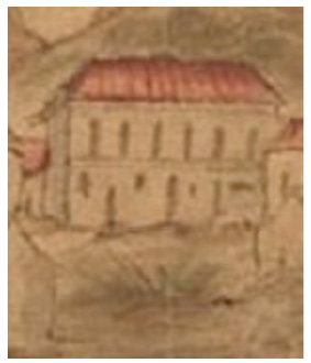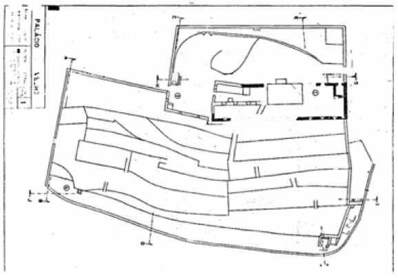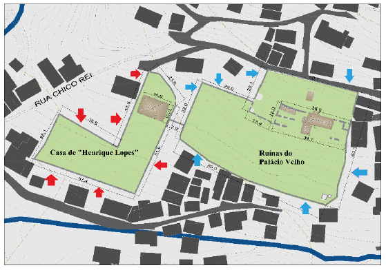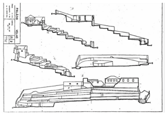 Observando-se o extrato contido na figura 5, especialmente em sua área frisada, notam-se no interior do Palácio Velho cinco edificações, com suas respectivas áreas fundiárias devidamente demarcadas com muros de pedra seca. É possível estimar que as duas propriedades situadas ao centro da área destacada correspondessem respectivamente à antiga casa de Henrique Lopes (à esquerda) e ao Palácio Velho propriamente dito (à direita) a deter a maior área cercada entre muros.
