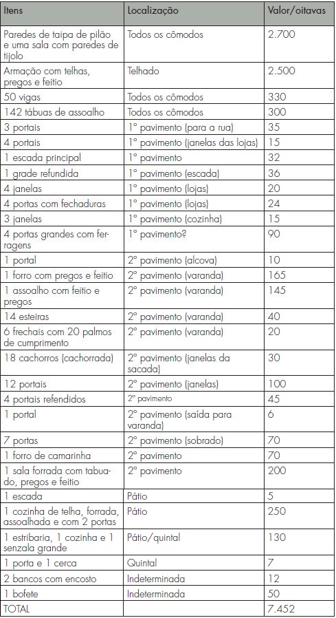 Não se tratava, sem dúvida, de um sobrado qualquer. O primeiro piso, no nível da rua, abria-se em três portas de entrada, com acesso à loja. Esse espaço, construído possivelmente para abrigar um ponto comercial, apresentava menor requinte ornamental, se comparado ao pavimento superior, destinado aos aposentos domésticos senhoriais. Tal disparidade refletiu-se na avaliação dos componentes arquitetônicos. Desconsiderando-se os itens estruturais mais caros da edificação (paredes, telhado, vigas e assoalho), o conjunto de elementos presentes na loja foi orçado, na apreciação dos carpinteiros responsáveis, em 267 oitavas de ouro. Já o segundo piso atingiu valor três vezes maior, estimado em 901 oitavas de ouro, excluindo-se uma cozinha equipada com cobertura de telhas, forro e assoalho, fixada no pátio, avaliada em 250 oitavas de ouro, cujo propósito seria o atendimento específico do sobrado. Por fim, aos fundos, os aposentos destinados às pessoas escravizadas e aos animais eram os mais modestos, calculados em 130 oitavas de ouro.