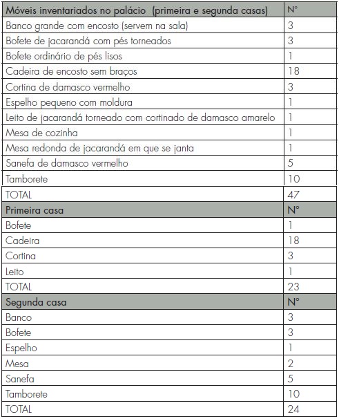 A repartição dos móveis deixa entrever que as duas casas do palácio possuíam função complementar, mas distinta. O único leito inventariado, de jacarandá torneado, ornado com cortinado de damasco amarelo franjado de prata, fixava-se na primeira casa. Seria esta a residência do governador? A exiguidade dos móveis e dos utensílios nela existentes, apenas cama, bofete e três cortinas, faz duvidar disso. Desenha-se, antes, uma estrutura modesta, talvez destinada ao usufruto do secretário de governo ou de algum hóspede itinerante, que ali encontraria local de repouso e pernoite. O jogo de cadeiras também listado nessa casa sugere a existência de um pequeno depósito anexo, onde eram guardados utensílios em excesso ou pouco utilizados na edificação principal. A residência oficial era, sem dúvida, a segunda casa. Identificam-se ali pelo menos três cômodos - quarto, sala e cozinha - com móveis próprios, a exemplo da mesa de cozinha e dos bancos da sala. Mas se isso foi verdadeiro cabe perguntar: onde estaria a cama utilizada pelo governador? É possível deduzir tratar-se de um dos leitos adamascados requisitados pelo capitão-mor em seu próprio testamento. O mesmo se pode dizer para os demais adornos domésticos que ornamentavam a casa do general. Onde estariam? À exceção das cinco sanefas de damasco vermelho (usadas possivelmente nas portas) restantes no inventário, todos os outros itens devem ter sido arrolados no testamento de Henrique Lopes. Outra possibilidade é a de que tais itens pertencessem ao governador e, nesse caso, não tenham sido tomados a rol.