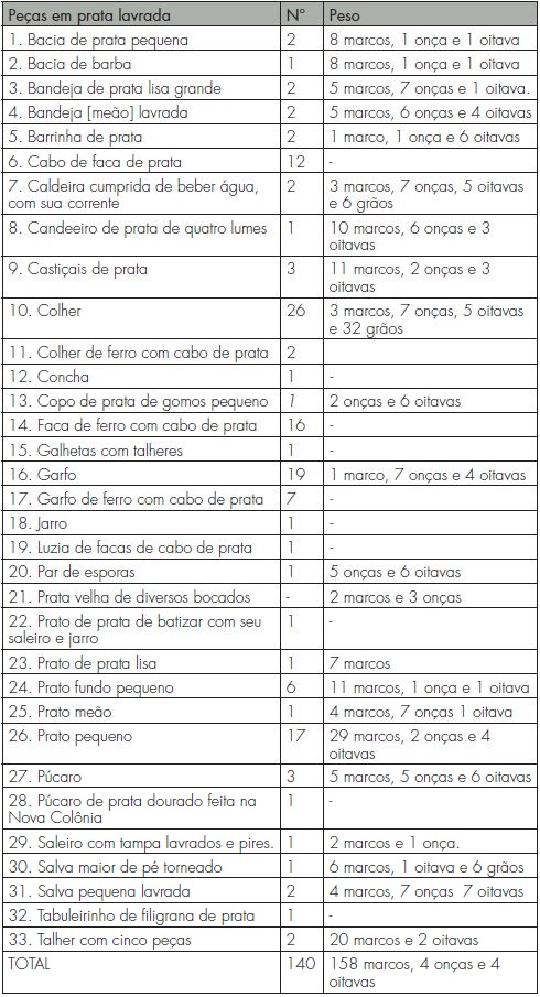 Conforme mostrado no Quadro 2, na categoria de peças, roupas e trastes arrolados na casa de Henrique Lopes, existiram 32 objetos que somaram 93 itens. Há que considerar o significado específico de cada item, para dar sentido ao funcionamento de um complexo doméstico que extrapolava o ambiente privado e ganhava extensões públicas manifestas. Isso é particularmente evidente para a análise dos materiais alocados no Palácio Velho, pois que ali estiveram objetos que adornaram a residência dos governadores da capitania, mas não só. Também a casa do anfitrião se prolongou até a sociedade colonial de Vila Rica, com ela trocando símbolos e significados diversos.
