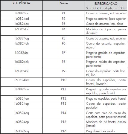 2) Estrôncio está presente principalmente nos couros do espaldar (P9 e P10) e em menor quantidade no assento. Estes pontos P9 e P10 apresentam também maior quantidade de Ca, Pb, Mn e Ti, o que pode revelar processos de feitura diferentes ou desgastes, bem como restauros e aplicações de produtos de limpeza.37 Estes poderiam ser elementos presentes no couro, mas devido ao uso teriam suas quantidades diminuídas no assento e teriam sido mais preservados no espaldar. Os pontos de couro também apresentam grandes quantidades de Br, sugerindo um elemento adicionado a tal pele. Outros elementos presentes no couro em quantidades variadas e pouco esclarecedoras são: enxofre (S), K, Ti, Pb, Mn e Cl.