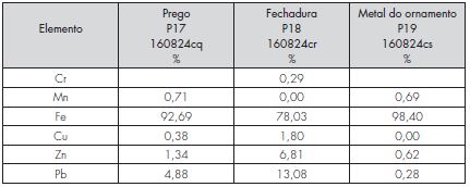 5) Nos pregos (pontos pretos - P2 e P16), nas pregarias grandes (P7 e P11) e nas pregarias pequenas (P8 e P12), observamos diferentes constituições desses metais.