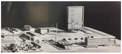 Os principais planos encampados pela Ceoc, contudo, tinham envelhecido entre sua concepção, na década de 1940, e a decisão de construí-los, no começo dos anos 1950. O período viu a consolidação da arquitetura moderna no Brasil - o prédio do Ministério da Educação e Saúde (MES) foi inaugurado no Rio de Janeiro em 194332 - bem como a consagração mundial da arquitetura brasileira, que passou a representar cada vez mais a “imagem do país”.33 Ainda em 1943, fora realizada a exposição Brazil Builds no Museu de Arte Moderna de Nova York34 e na mesma cidade estava em construção, desde 1948, a sede das Nações Unidas, com projeto de Oscar Niemeyer e Le Corbusier. O grupo no poder percebeu que a arquitetura moderna potencializaria a relevância de seus planos para Curitiba. Mesmo enfrentando resistências, Munhoz da Rocha acabaria por patrocinar a atualização dos projetos antigos de acordo com essa visão.