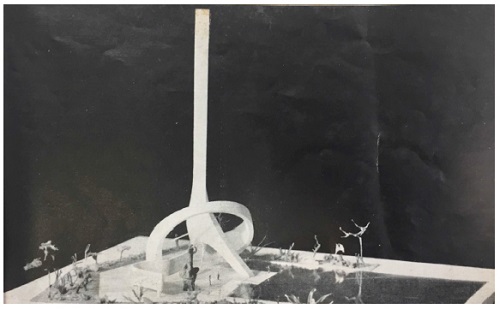 Munhoz da Rocha insistiu em sua ideia, provavelmente negociando com a equipe de Azambuja. Em meados de 1953, uma proposta híbrida saiu na revista Brasil Arquitetura Contemporânea.111 O “Monumento do Centenário do Paraná” (figura 3) mantinha o espelho d’água e o obelisco, mas havia também uma estátua de formas quase abstratas - pouco a ver com o “adolescente” Paraná - representando “o homem que desbravou a região”. Atrás, havia o painel com um relevo “descrevendo a história e as riquezas” do estado. “O monumento”, dizia a legenda, “será localizado no meio da praça em que se constrói o Centro Cívico de Curitiba, realização de importância no presente surto da arquitetura brasileira”. Ao menos uma maquete foi construída de acordo com essa concepção, porém suas imagens não foram amplamente divulgadas, permanecendo em acervo pessoal.112