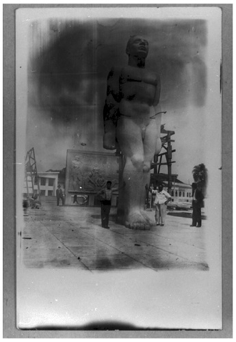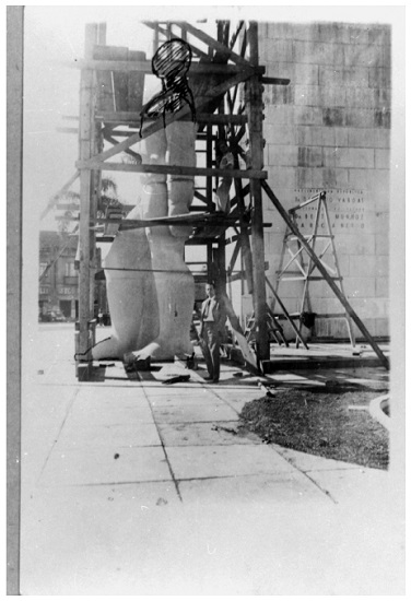 Entre as fotos recebidas por Stenzel não há nenhuma do último bloco de granito. Uma imagem curiosa guardada pelo escultor junto à correspondência, todavia, revela certa expectativa durante a instalação da estátua. Stenzel posa diante da figura envolta em andaimes, faltando-lhe a quarta e última peça, da cabeça. À caneta, foi desenhada, possivelmente por Stenzel, a silhueta faltante, como que para imaginar o resultado final. É um desenho simples, sem feições, como os primeiros modelos trocados entre os escultores (figura 7). A apreensão transmitida pela imagem antecipa as reações que se seguiram a sua instalação, quando foram revelados traços bem diferentes daqueles impressos aos modelos de argila (figura 8).