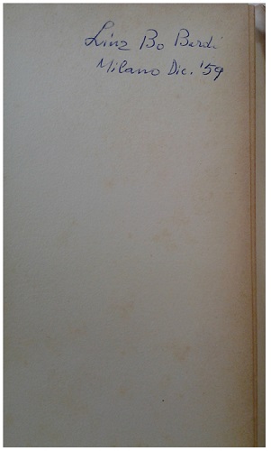 Durantes as investigações no acervo da arquiteta38 foi encontrado o livro Architettura e restauro, escrito por Renato Bonelli39 e publicado em 1959 pela editora Neri Pozza (Veneza). Nas primeiras páginas, com a letra de Lina Bo Bardi, está anotado: “Lina Bo Bardi, Milano, Dic. ‘59”.