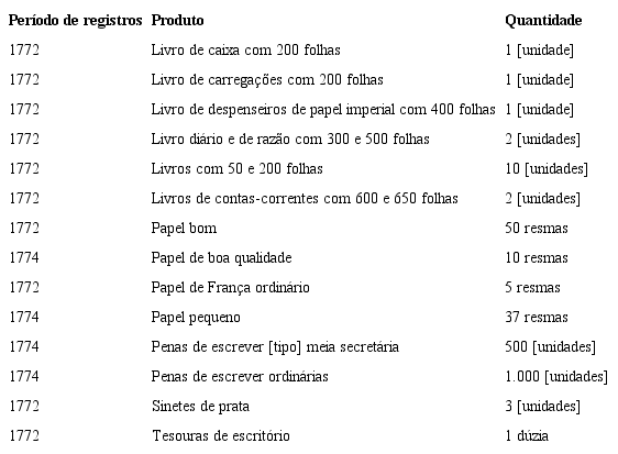 A primeira remessa de mercadorias (Quadro 1) continha exclusivamente materiais de escritório, que foram comprados logo no primeiro mês por serem considerados primordiais para a boa administração das receitas e despesas da Real Extração. Assim, na carregação recebida pelos oficiais diamantinos, constam: livro de caixa com 200 folhas; livro de carregações com 200 folhas; livro de despenseiros de papel imperial com 400 folhas; livros de contas-correntes, um com 600 folhas e outro com 650; livros diários e de razão, um com 300 e outro com 500 folhas; e livros sem especificações, sendo 7 com 200 folhas e 3 com 50 folhas. Neles se registravam todas as informações sobre o custeio e a produção anual de diamantes, inclusive as despesas com os próprios materiais de escritório.
