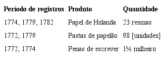 ABSTRACT: This article discusses the import, circulation and use of office supplies by the Royal Diamond Extraction in Minas Gerais during the last decades of the 18th century, questioning about their importance for the administration and fiscal control intended by the authorities of that period. Utilizing sources belonging to the Real Erário fund from the Historical Archives of the Portuguese Court of Auditors, we unveiled the work of that institution and the consumption of account books, papers of varying quality and European manufacturers, quill pens and substances used in the production of iron gall ink. The study of those elements evinces not only their relevance to the bureaucratic activities of that society, but also a material dimension that we rarely see in the past. After all, such supplies and artifacts allow to understand some production conditions of documents preserved in archives and libraries.