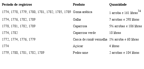 é certo que há indícios de uma entrada frequente de gêneros importados, como aguardente do reino, azeite de oliva, queijos do reino, bacalhau, sardinhas, vinho tinto, vinagre, ovas de tainha, camarão, arenques defumados, farinha do reino, manteiga de Flandres, gengibre, figos, passas, ameixas, amêndoas, entre outros.26