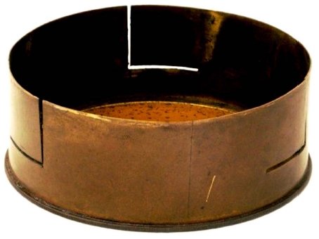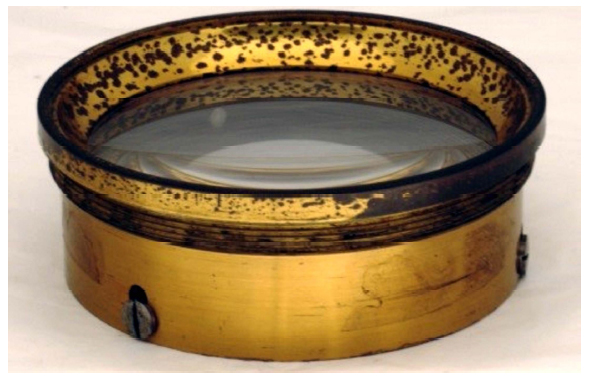 A lente objetiva encontrada na luneta nº 10.783 de Bamberg não apresenta punção do fabricante e está acondicionada na estante da reserva técnica. Esta pesquisa reuniu dados suficientes para afirmar que se trata de uma peça de reposição (Figura 6a) que foi adaptada ao eixo ótico do exemplar nº 10.783. Na Figura 6b, é apresentada a tampa de objetiva com cortes em L.