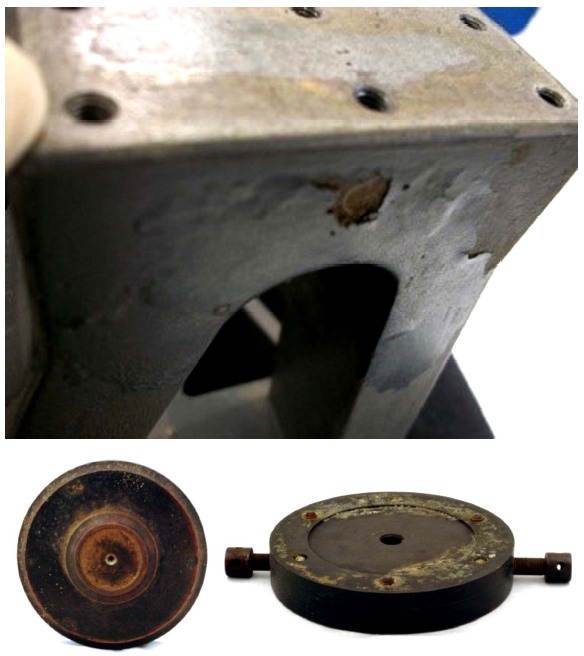Duas regiões da luneta apresentam corrosão típica de molhamento. Alguns parafusos da base, o fundo do elevador que pousa sobre ela e a região do micrômetro elétrico apresentam sinais de permeabilidade de água nas roscas e encaixes, onde houve contato entre ligas de diferentes potenciais de eletrodo, dispondo essas peças à degradação por corrosão galvânica: houve processo de corrosão ativa porque o meio de condução eletroquímica se formou.47 Por mais que seja estimado o potencial de eletrodo de um material isolado, nenhuma tabela referencia uma liga singular, com suas irregulares distribuições de elementos, em troca com outro material distintamente irregular em sua estrutura. O potencial real de um metal em dado eletrólito pode depender de vários fatores, entre eles: o número de reações possíveis em cada eletrodo, a formação de película, a formação de íons complexos, as impurezas na solução e a magnitude das correntes elétricas para os possíveis equilíbrios. Por isso, o potencial real será provisório e resultante de dois ou mais processos, sendo, portanto, comumente chamado de potencial de corrosão.48