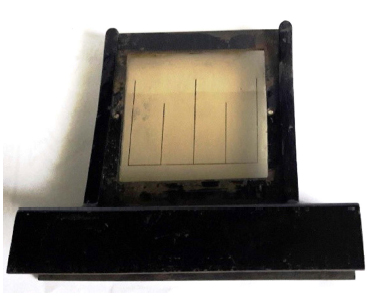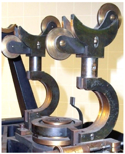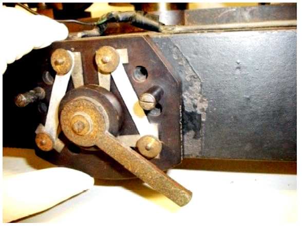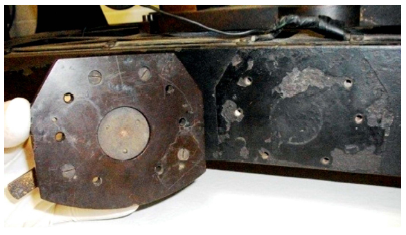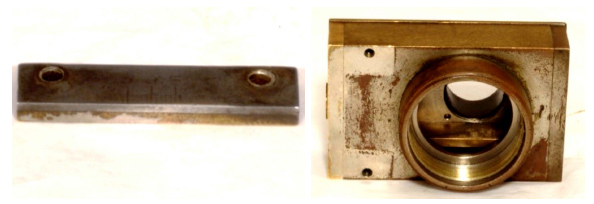 A placa de reposição da alavanca (Figura 8b) fica pouco acessível aos raios luminosos e, por isso, encontra-se em bom estado de conservação, translúcida. Entretanto, a corrosão ativa nos parafusos que restaram na alavanca evidencia que a placa se perdeu igualmente por corrosão ativa, possivelmente por aeração diferencial em eletrólito proporcionado pelas goteiras do pavilhão sobre o micrômetro elétrico suspenso no instrumento. É possível que a água mineralizada, típica de goteiras, tenha se depositado nas frestas internas e, sem ventilação, a baixa aeração levaria à perda de todas as peças dessa engrenagem. Não foi encontrado registro de quando teria sido confeccionada essa delicada peça de reposição.