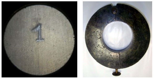 O registro fotográfico em lupa binocular garantiu a checagem da punção Bamberg exata (Figura 5a), em que a variável foi apenas a força do impacto. O perfil marcado no objeto (Figura 5e) era correspondente ao perfil da chave elétrica (Figura 5d) do sistema acotovelado do instrumento de passagem, mas não há nenhuma punção. Na balança analítica, constatou-se correspondência exata entre o nível do Talcott (Figura 5c) e seu contrapeso (Figura 5b).