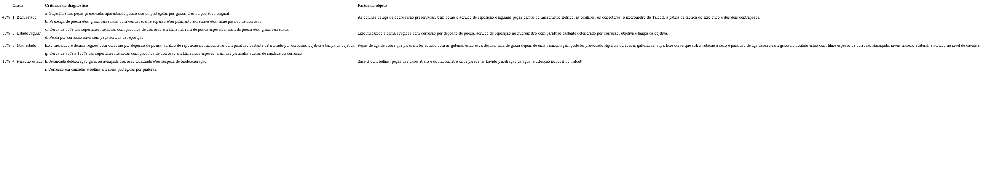 Enfim, os autores definiram os critérios de diagnóstico que seriam adotados e determinaram suas legendas. Entretanto, tamanha carga simbólica em diversas marcas na luneta nº 10.783 de Bamberg levou a equipe66 a votar por mantê-los e reconsiderar a avaliação prévia, que julgava em mau estado o conjunto do instrumento. Assim, a análise dos dados colhidos no diagnóstico por exame organoléptico, segundo os critérios de avaliação por fim adotados, considerou que 70% da materialidade do instrumento se encontra em condições regulares a boas de conservação, como pode ser visto na Tabela 1.