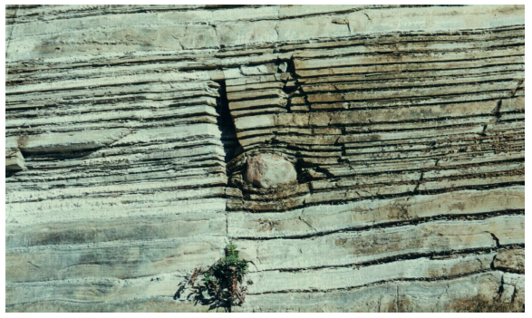 O pedido partiu do conselheiro Vinicius Stein Campos que solicitou o tombamento de uma pedreira em vias de desativação. A justificativa para tal destacava o interesse didático-científico e turístico, tendo em vista a área abrigar um mostruário de rochas de excepcional valor como testemunho de glaciações pretéritas no continente, portanto, remanescente de paleoclimas. A estrutura foi formada no passado geológico a partir de lagos temporários localizados à frente de geleiras e alimentados pelas águas do degelo. A variação das camadas de sedimentos depositados nesses lagos, ora mais claros ou mais escuros, ora mais delgados ou mais espessos, conferiram à rocha varvito uma qualidade estética única, ou seja, a característica rítmica resultado da oscilação entre períodos mais frios, alternados a períodos mais quentes (figura 1). A importância científica aliada à qualidade estética do conjunto de rochas enquadrava-se no escopo legal, tanto como monumento natural como recanto paisagístico. Mas a justificativa para o tombamento atrelou, também, o papel histórico da rocha como material construtivo característico da identidade arquitetônica e urbanística da cidade, sendo usado como revestimento e calçamento,9 mostrando a relação indissociável entre natureza e história, característica desse primeiro período. Ou seja, é sob o amparo da legislação incidente que esses casos pontuais de tombamento têm, em comum, a ampliação do olhar dos conselheiros para o que se chamava de patrimônio histórico. Apesar de Rodrigues10 apontar esse primeiro período do órgão como caracterizado por práticas que permaneciam nos limites da ortodoxia do Sphan,11 reproduzindo a atribuição de valor unicamente a partir da materialidade, atrelando o valor histórico à história da arquitetura, colocando o foco nos ciclos econômicos e tratando os centros históricos como um único monumento, percebe-se, também, contraditoriamente, os avanços e ineditismos, resultado de posturas diferenciadas que possibilitam ampliar a visão em relação ao que a autora chamou de tradicionalismo da área preservacionista.