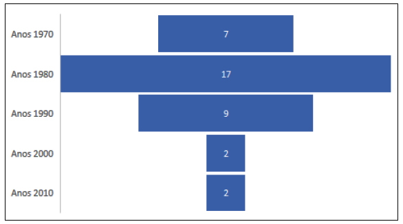 As políticas de patrimônio cultural no estado de São Paulo, durante os anos 1980, foram profundamente marcadas pela expansão e consolidação das práticas voltadas à preservação das áreas naturais. De um lado, verifica-se a ampliação quantitativa desses objetos, como se pode constatar no gráfico 1. Comparados os tombamentos por década, observa-se que o auge da identificação e proteção se deu nos anos 1980, declinando consideravelmente nos momentos seguintes. Nos anos 1990, o número de tombamentos de áreas naturais foi cerca de 50% inferior à década anterior e, nos anos seguintes, esse número cai abruptamente, representando um retrocesso na identificação, com número bem abaixo da década inicial. Os anos 1980, do ponto de vista quantitativo, indicam, assim, o auge na trajetória de preservação do patrimônio natural paulista.