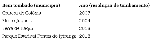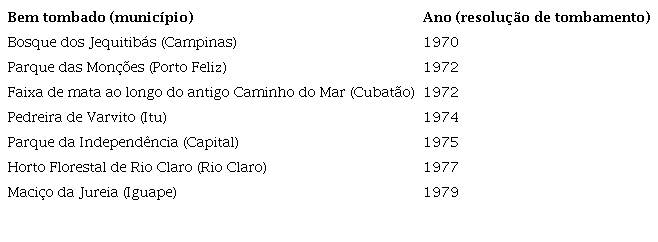 Em primeiro lugar, alguns bens tombados foram resultado da atribuição de valor a um objeto que constitui uma área natural em si mesma, como se viu no caso do Bosque dos Jequitibás, Parque das Monções e Pedreira de Varvito, e será visto adiante no tombamento do Horto de Rio Claro e Maciço da Jureia.