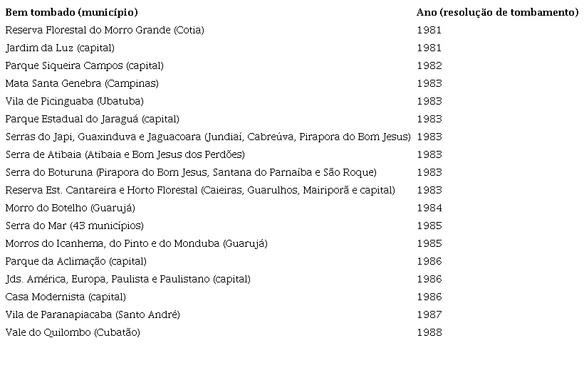 Por outro lado, a expansão é também qualitativa, pois há inserção de novas tipologias de áreas naturais, mostrando a diversificação de objetos. Também se implementam inovações na gestão, com o atendimento de demandas sociais crescentes e a elaboração de uma normativa legal específica para orientar procedimentos em relação ao tombamento dessas áreas. O marco central das políticas nessa década foi, sem dúvida, o tombamento da Serra do Mar, por meio da Resolução SC nº 40 de 6 de junho de 1985.