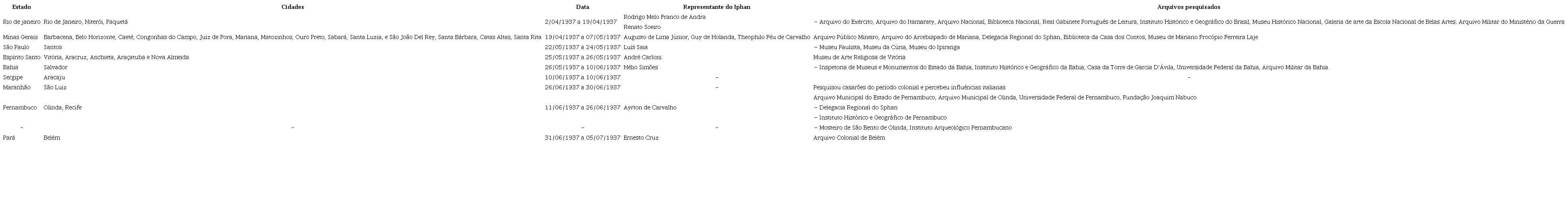 Em 2 de abril de 1937, com uma bolsa de estudos da American Council of Learned Societies, Robert Chester Smith desembarcou no Rio de Janeiro. A viagem teve duração de quatro meses e, durante aqueles 120 dias, percorreu, de trem, avião, ônibus e a cavalo, diversas cidades brasileiras. A finalidade era entender as manifestações da arte colonial por intermédio da arquitetura, do mobiliário, das pinturas e dos arquivos visitados. No Quadro 1, estão listadas todas as cidades visitadas por Smith durante a viagem de 1937, o tempo de estadia, o representante do Sphan que o recebeu e os principais arquivos pesquisados. Todas as viagens realizadas de avião em 1937 foram feitas pela empresa Panair do Brasil S.A. As despesas áreas foram pagas com o auxílio de mil dólares concedido pela American Council of Learned Societies (ACLS) e com ajuda financeira do Sphan.