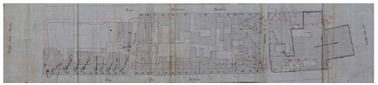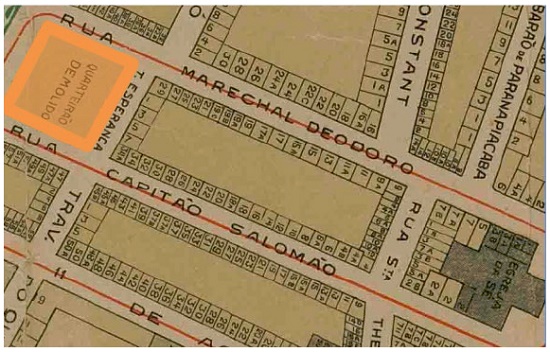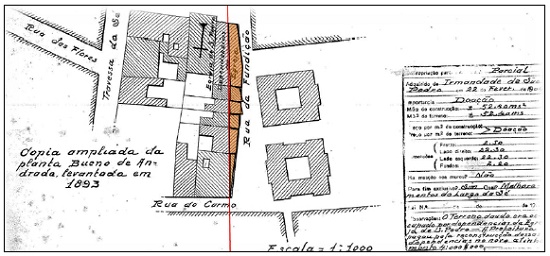 Colocando em termos o itinerário da demanda que a tratativa do arcebispo exigia, ficava implícita a colaboração de um engenheiro, não identificado na documentação, para estudar a área-alvo. Dessa forma, por meio da operacionalização da cartografia, isto é, de uma planta com base cadastral, todos os lotes do entorno e da adjacência foram levantados, com a Antiga Matriz no Largo da Sé sendo o parâmetro comparativo. Assim, planta em questão (Figura 3) dá uma dimensão da área-gênese do desmonte, das primeiras demolições que iriam transformar a fisionomia da antiga área central da cidade. Compreendida entre o Largo da Sé e a Praça João Mendes, no miolo da geometria do Triângulo central, essa faixa notavelmente extensa abrigava um total de 61 lotes distribuídos nas duas quadras conformadas pelas ruas Capitão Salomão (26 lotes), Travessa da Esperança (3 lotes), Marechal Deodoro (15 lotes) e Santa Teresa (17 lotes). Ao Norte, existia uma terceira quadra exatamente no Largo da Sé, onde se situava a Antiga Matriz.