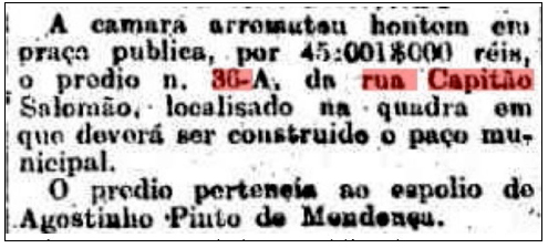 Para alargar a rua da Fundição, foram já desapropriados e demolidos os predios que ficavam na linha lateral da egreja de S. Pedro, e, em seguimento desse acertado plano, a Camara Municipal resolveu prolongar até áquella a rua do Quartel, cortando a travessa da Sé e os fundos da dita egreja e da casa vizinha desta, na esquina.