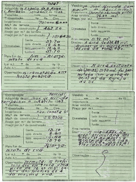 Neste ponto, as duas plantas desapropriatórias oriundas do Departamento de Desapropriações, da quadra que originalmente conformava o Largo da Sé (Figura 1 e 2), grafam o contexto em que os prédios adjacentes16 à Igreja de S. Pedro foram subtraídos. Os selos deram registro às expropriações de dois proprietários particulares, corroborando a ocorrência entre 1902 e 1903 da desapropriação, em uma operação de permuta justificada para alinhamento da rua da Fundição: