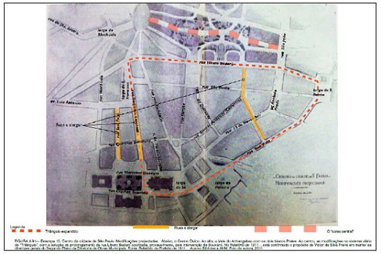 Tendo em vista a informação dos selos da planta desapropriatória sobre o cálculo da municipalidade para valores do metro quadrado na área do Centro, ela evidencia o parcelamento de solo existente para a área no começo do século XX. De modo a afirmar a tese para uma permanência de longa duração desse mercado imobiliário elitizado na área da Sé, tal como Beatriz Piccolotto Siqueira Bueno (2016) veio destacando.46 Assim a planta, vindo a corresponder à operação de desapropriação de todo o quarteirão do miolo da faixa demolida, sendo ela despendida pelo presidente da Província, Albuquerque Lins, no processo originado no Decreto nº 1716/1909 (Figura 9).