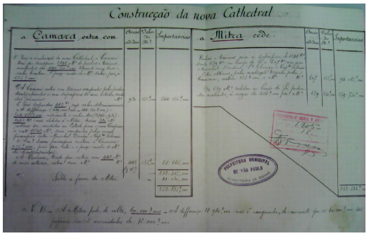 tendo ouvido o parecer do Revmo. Cabido e da commissão executiva das obras da Cathedral, deliberou-se acceitar o alvitre, em boa hora lembrado por V. Ex.ª em nome do exmo. Sr. Presidente do Estado e de accordo com a exma. Prefeitura, de ser a nova Cathedral construída no local actualmente ocupado pelas obras do Paço Municipal. […] nossa questão, que tanto interessa à magnificencia da Egreja paulista, como contribue para o prestigio de nosso Estado e embellezamento da nossa capital.
