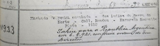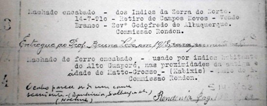 Um item posterior no tempo, mas anterior na catalogação, não é citado no artigo. Precisa ser citado, contudo, por ter as mesmas características e criar uma perspectiva entre objetos e uma sequência de tipos textuais que constroem a narração do contato no âmbito da documentação museológica. No final, a data está escrita à mão. Sob o número de ordem 1918 descreve-se: