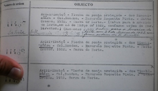 Não busquei encontrar o redator de cada descrição relativa a cada número de ordem. Com a ideia de empresa coletora pressupus que a classificação foi realizada com base nas informações do coletor, do doador e do classificador. A falta de método na coleta dos objetos se reflete na catalogação, e a escrita antropológica se dá por sequências de descrições com variação de pormenores. O cotejo entre os textos, contudo, salienta que há acréscimos de informações em objetos semelhantes, conforme o acúmulo de conhecimento a respeito deles. O paralelo entre os textos dá voz também ao objeto que sofre pela ausência de detalhes. Alguns dos problemas desse método catalográfico são o mesmo objeto ter duas classificações diferentes e a discrepância nas descrições de objetos semelhantes. Uma das justificativas dessa etnografia catalográfica reside na ideia de que uma forma de mensuração de uma sociedade/cultura estaria em encontrar e descrever objetos que atestassem a narrativa sobre em qual estágio do desenvolvimento está a habilidade de fabricar e utilizar artefatos.