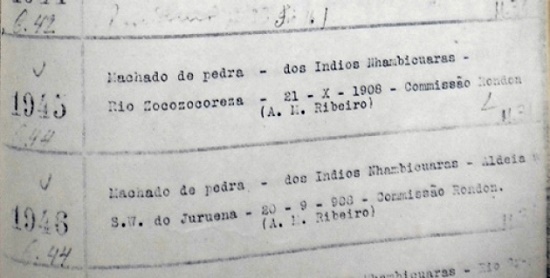 A partir deste ponto dou destaque aos machados. Durante a pesquisa no Livro de Tombo do Museu Nacional me deparei com itens avulsos e com sequências: de flechas, de adornos, de ligas tibiais, de machados etc. Entre as sequências e os avulsos encontrei os machados de número 1945 e 1946, e outra sequência que termina em 2213 e 2214. As descrições apresentam pequenas discrepâncias, no entanto, a análise sobre o uso e as relações entre objetos mostra que são repetições, cópias uns dos outros. As informações sobre os machados de pedra seguem o padrão do tipo textual descritivo do Tombo, especificam a etnia Nhambiquara e a localização geográfica rio Zococoreza (número 1945) e sudoeste do rio Juruena (número 1946), coletados com um mês de diferença, entre setembro e outubro de 1909, por “A. M. Ribeiro” (Figura 12). Os últimos números das sequências, 2213 e 2214, não especificam a etnia, mas uma caracterização os diferencia dos objetos anteriores: “Machado encabado - dos Índios da Serra do Norte. 14-7-910 - Retiro de Campos Novos - Veado Branco - Sevº Godofredo de Albuquerque. Comissão Rondon”.119