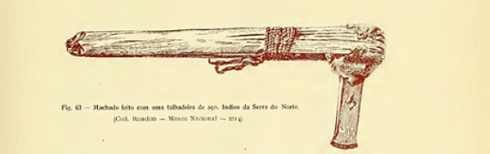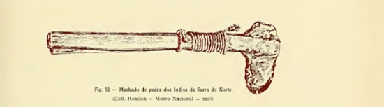 Mesmo que na figura 52 de Rondônia seja definido apenas como “Machado de pedra dos índios da Serra do Norte”,120 o objeto com o número de ordem 2208 é o tipo modelar (este item também aparece em “Notas…”) (Figura 13). O tipo textual descritivo usado em outros textos segue o parâmetro das informações fragmentárias que dão a visão geral: feito de diabásio, cuneiforme, com peso médio de dois quilos, preso ao cabo de madeira por cordéis feitos de um caule flexível e breu.121 Os números de ordem 1945, 1946 e 2213 são representações deste modelo. São itens repetidos. Ainda que as descrições do Tombo apresentem discrepâncias, paralelos com outros textos mostram que, mesmo sendo feitos de forma tão simples, são sólidos e com cabos resistentes.122