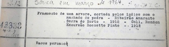 É preciso contextualizar que essas coleções foram amealhadas por certos personagens, mas catalogadas por outros. Como já apresentado, essas coleções se encontram na transição das coleções casuais para as coleções etnográficas, balizadas pela pesquisa de campo, com correta observação e anotação de informações. Ainda que tenham sido coletadas por pessoal ligado diretamente à Comissão Rondon, estes trabalhavam da mesma forma que os agentes coloniais que organizavam coleções casuais. Como já comentado, o artigo “Notas…” é a versão impressa da apresentação de Roquette-Pinto no XVII Congresso Internacional de Americanistas, em Londres, 1912. A apresentação e o artigo foram feitos com base nessas duas primeiras coleções doadas por Miranda Ribeiro, em 1910, e pela Comissão Rondon. Em 1911. Neste ponto, Roquette-Pinto ainda realiza um trabalho de etnografia de gabinete, catalogando objetos coletados por outros.