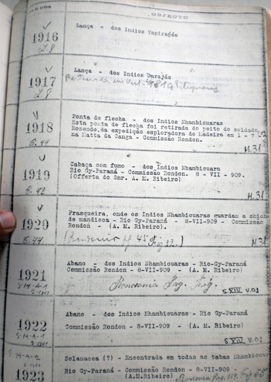 Os itens doados por Miranda Ribeiro, em 1910, contavam 49 peças. Os objetos se dividiam em um terço do material dos índios Urupá, o restante era dos Nhambiquara do Ji-Paraná. O material destes últimos era composto basicamente de “flechas, arcos, machados, cabaças, cuias, abanos, matérias-primas (breu, plantas)”. A doação feita pelo tenente Pyrinneus, em 1912, é a que tem menor quantidade de objetos, nove objetos (“2 pares de pulseiras, 2 colares, 1 par de brincos, 1 enfeite de nariz e 1 jacá pequeno”).69