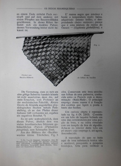 “Notas sobre os índios Nhambiquaras do Brasil-Central”,82 enviado ao congresso de americanistas, também foi publicado na Revista Brasileira - Brasilianische Rundschau. Era um periódico do Conselho do Comércio Brasileiro de Hamburgo que começou a circular em 1912 com edições bilíngues, em duas colunas, alemão e português. O texto versa sobre a coleção do Museu Nacional, com os números de ordem no Livro de Tombo, imagens e descrições dos objetos. O material é composto por objetos físicos, glossários, compreensão de subdivisões de etnias, localização geográfica etc. Como já mencionado, este material etnográfico e antropológico foi colhido por Candido Rondon e por Severiano Godofredo de Albuquerque entre os anos de 1910 e 1911, no início dos contatos com os Nhambiquara, e doado por Miranda Ribeiro em junho de 1910 e em janeiro de 1911 (provavelmente, a doação da Comissão Rondon).83
